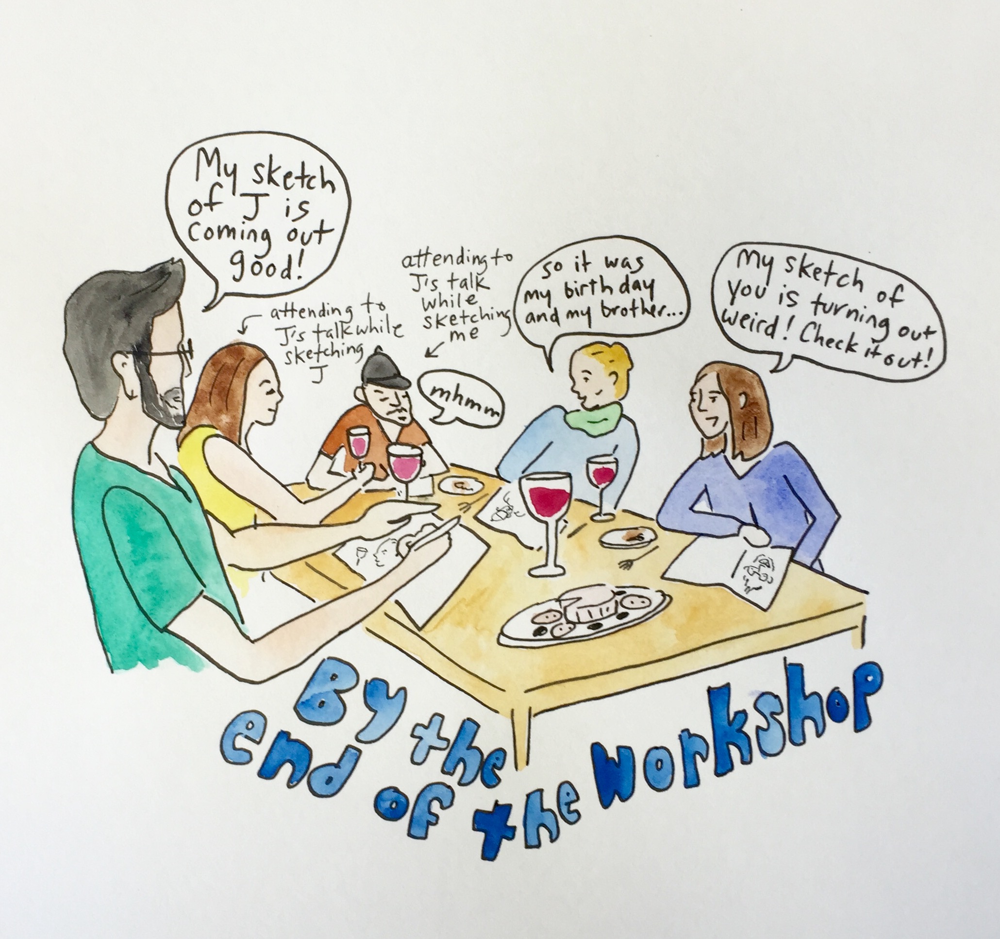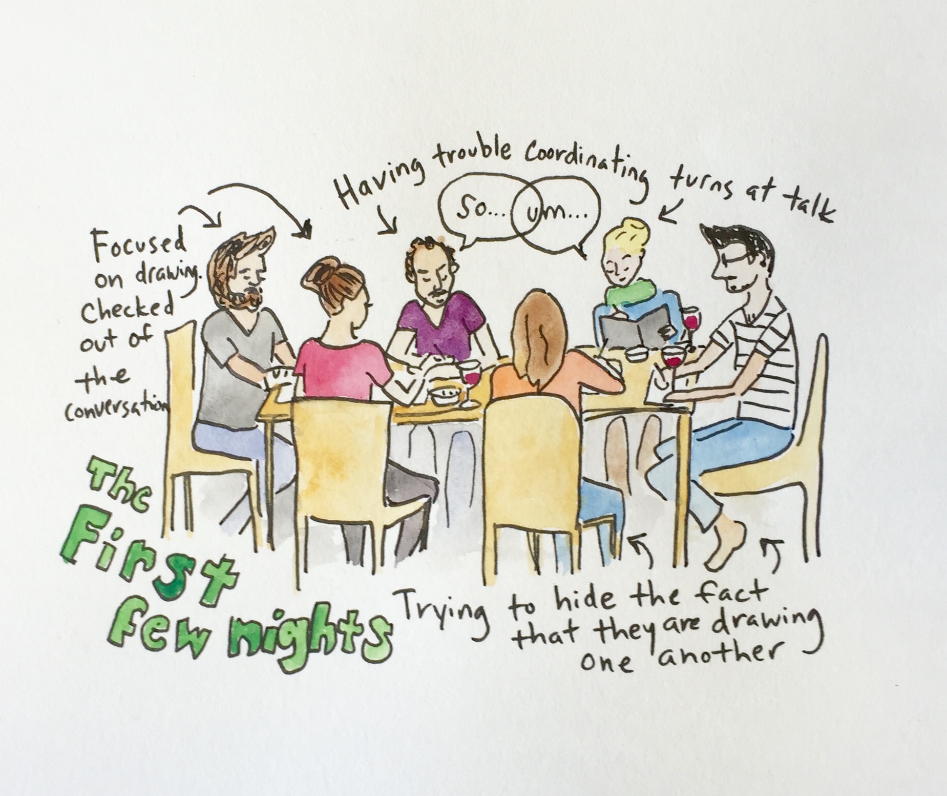 The first few nights were very quiet. We were having trouble coordinating turns at talk: often speaking over one another, laughing, and then falling silent. Bids at telling stories often faltered and then puttered out. Aside from the general challenges of paying simultaneous attention to what we experienced as multiple domains of activity and of getting to know a new group of people, these problems may have in part arisen from the fact that we weren’t using eye gaze to manage talk in our usual ways. Though norms for the use of eye gaze vary widely within and across cultural contexts, we participants were all accustomed to attending to gaze in order to “monitor one another’s mutual perceivings”(Goffman 1964: 95). However, at these dinners our gaze was alternately unavailable (when looking down at a drawing in progress) or fixed on another participant’s face (when studying the subject of a sketch) for unusually long periods of time. This caused disruption to our habitual practices for initiating talk or displaying our engagement in dinnertime conversation (Goodwin 1981; Rossano 2013).