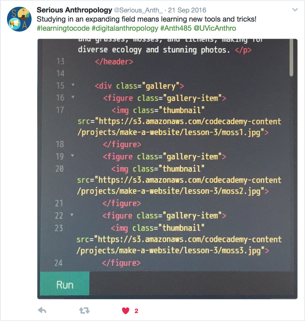It hasn’t always been easy; the relevance of digitally-based assignments is frequently questioned in academia. I have also, at times, regretted the headaches involved in teaching code when I could just have students use streamlined, institutionally-created online environments. I have even had the gut-wrenching moments of rejection where students express, in no uncertain terms, that they did not “go into anthropology to learn HTML.” But I also expected these struggles.