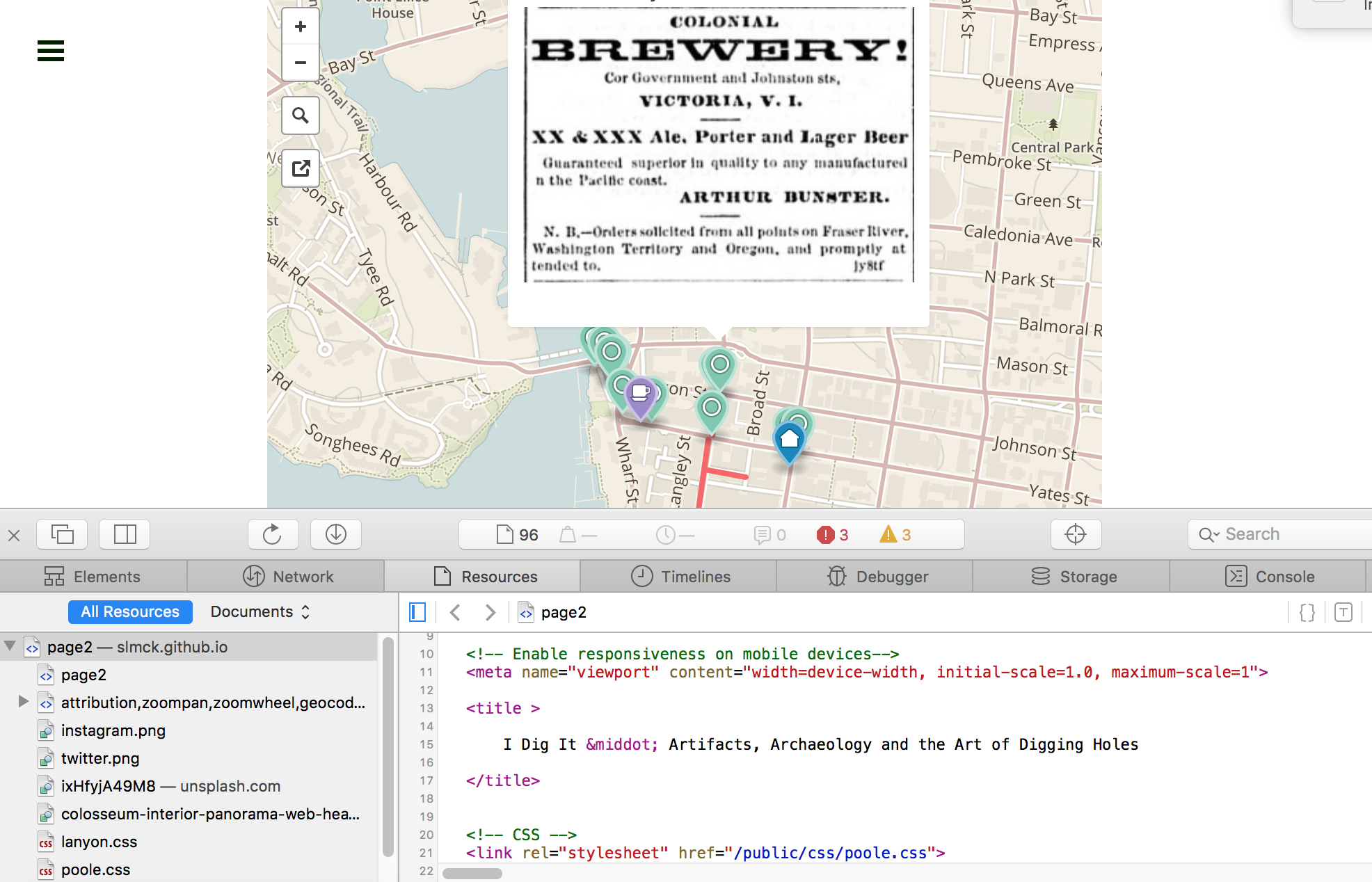 I Dig It! Example of a student website, coded from scratch and including interactive historical map.